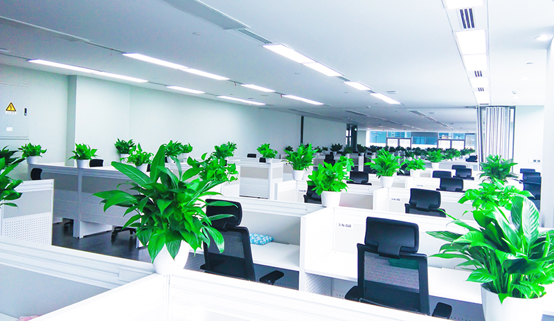 关于搭配布置方面:将植物摆放在不容易被碰撞和不妨碍工作的位置上。坐在靠窗的位置的员工可以利用自然光为盆栽提供养分。对于需要长时间使用灯光的员工,应注意保持盆栽与台灯之间超过30厘米的距离,以防止绿叶受到灼伤。